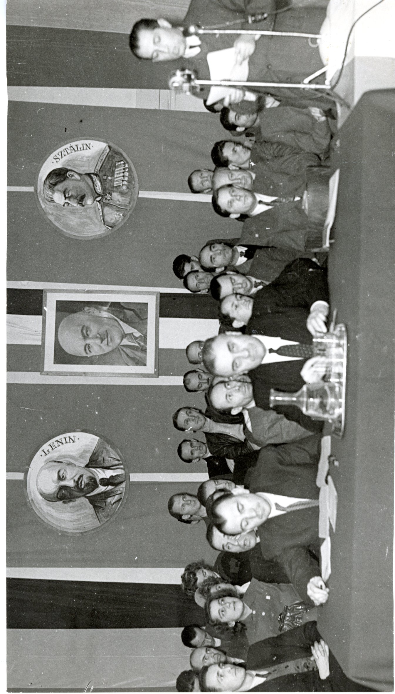 Elnöki asztal szónokkal, tanári karral (Lenin, Rákosi, Sztálin képei)