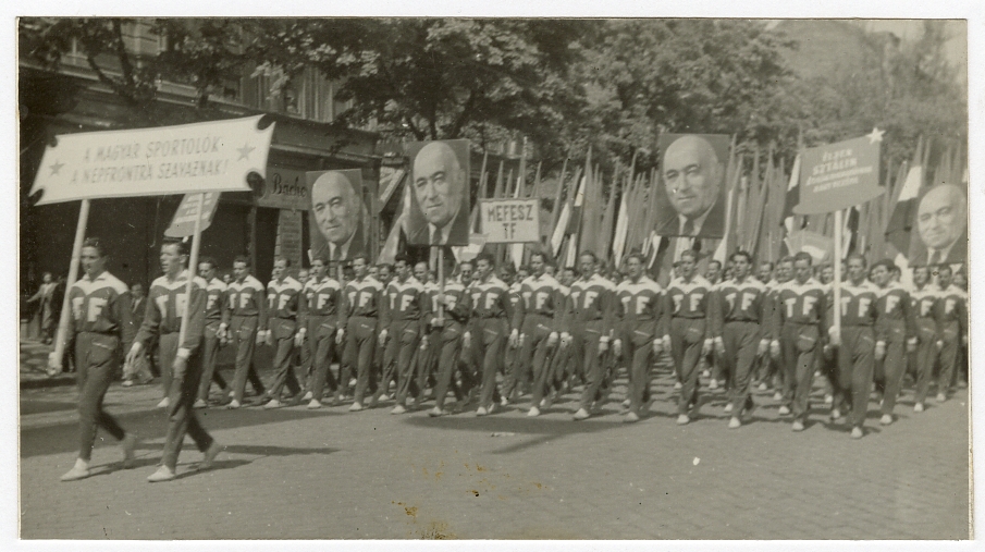 TF-es felvonulók Rákosi arcképével és táblákkal