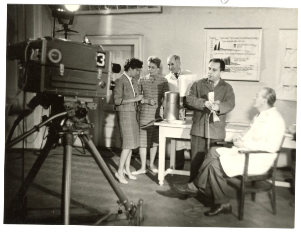 Dr. Kereszty Alfonz tanszékvezető a tévékamera előtt. A képen szerepel még többek között Vitray Tamás.