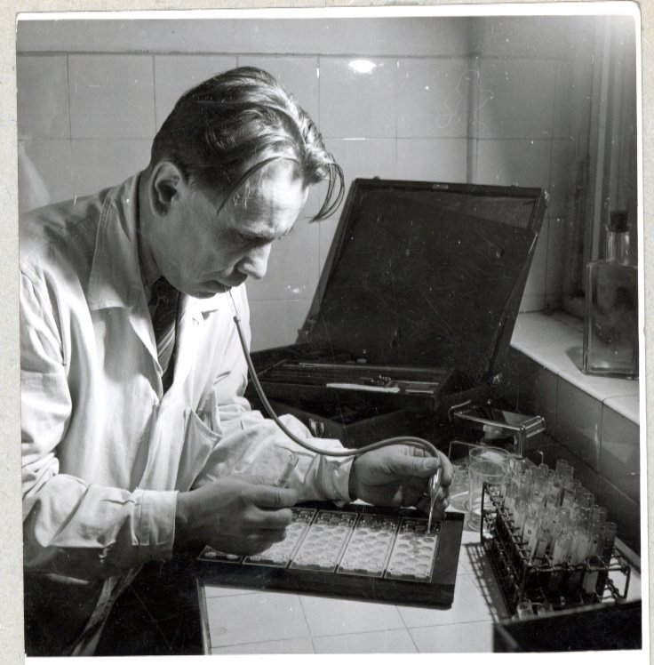 | Dr. Kovács Elek a Wassermann helyett Mandula-reakciót végez. Ezzel havi 2.000.- frt. megtakarítást ér el. 1951-1960 között készült. | ||