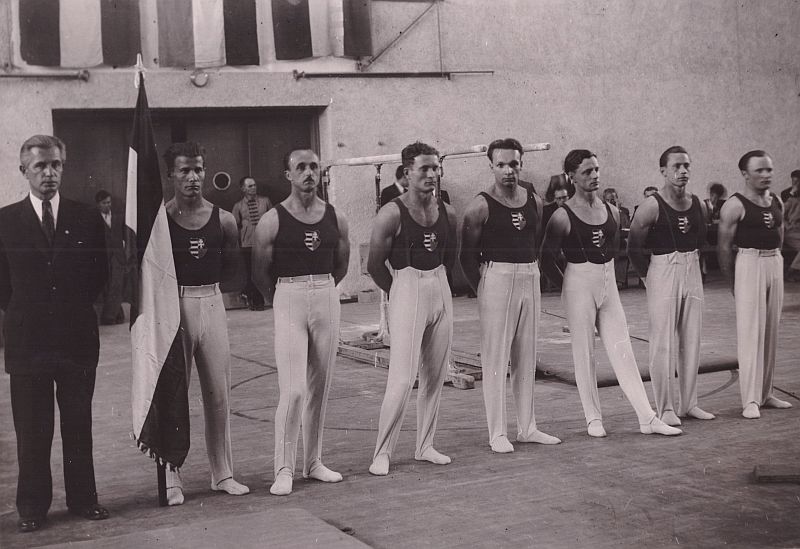 Férfi tornászcsapat zászlóval (TE képgyűjtemény)
