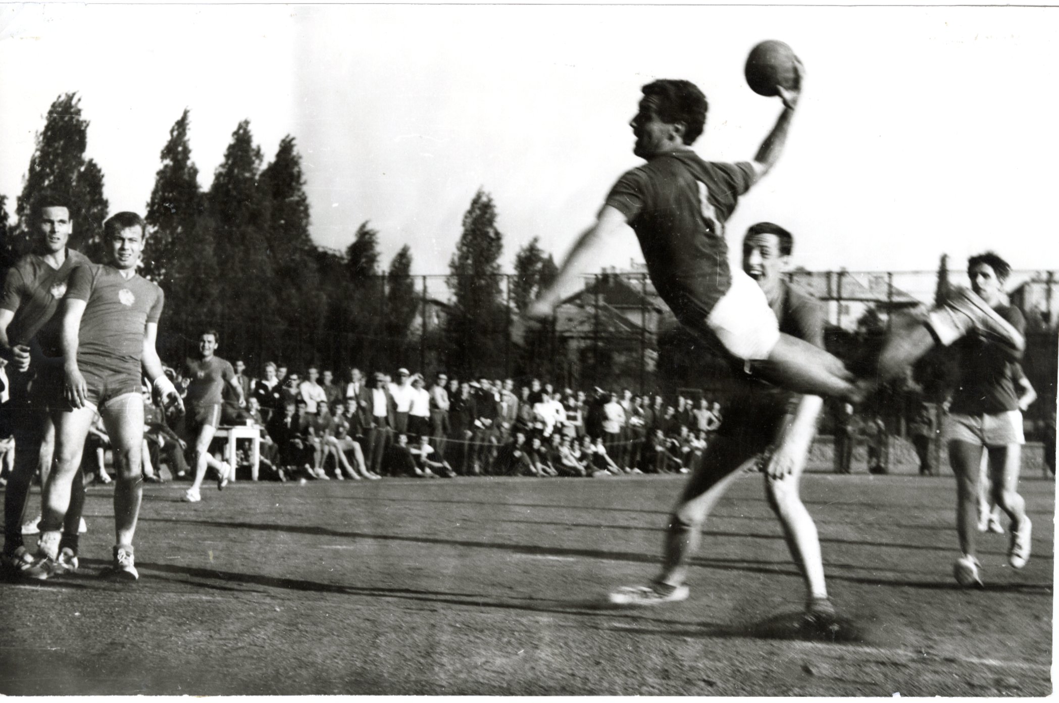 egyetemtörténet, Testnevelési Főiskola, TFSE, Honvéd, kézilabdázás, kézilabda, mérkőzés, sportesemény, sportoló akcióban, dobó mozdulat, szabadtéri sportpálya